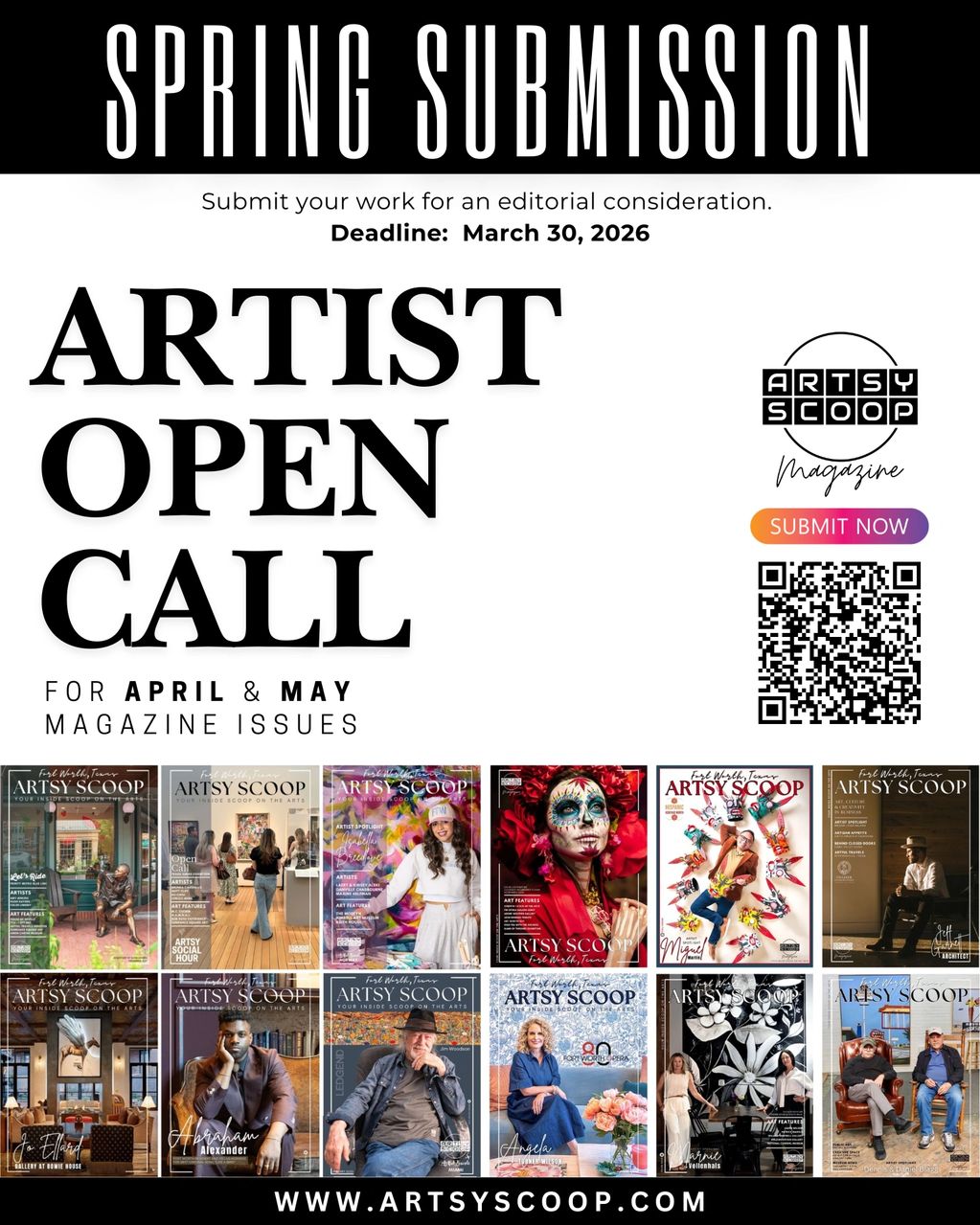 Two selected artists will receive a dedicated half-page feature in Artsy Scoop Magazine, sharing their story and artistic vision with our readers.